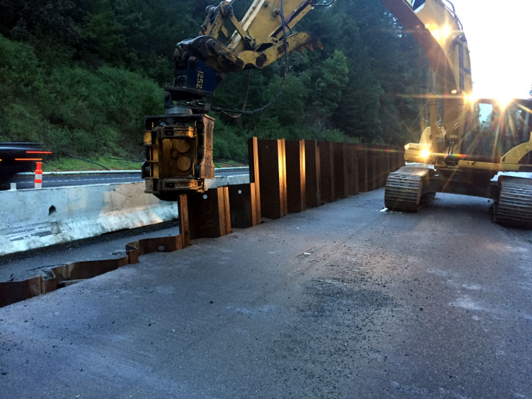 When a section of Highway 101 began sliding due to a saturated hillside, Caltrans asked WCC to help the general contractor to provide a sheetpile shoring wall to stabilize the highway. Our excavator-mounted vibratory hammer is perfect for jobs such as this.