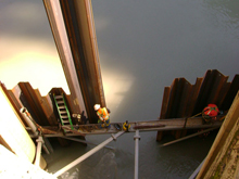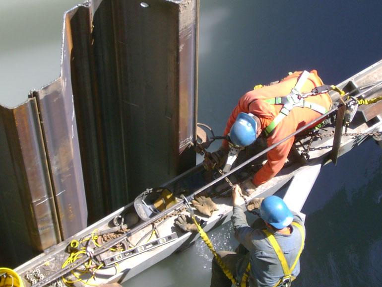 Originally constructed in 1948, the historic Mud Mountain Dam, located on Washington's White River, is 432 feet high and 1,600 feet thick at the base. The core of the dam consists of sand, gravel, and a three-foot layer of quarry rock that covers the entire structure to protect against rain wash. In 2008, WCC built a reusable cofferdam for the US Army Corps of Engineers which allowed inspection and repair of the underwater portion of the dam. This cofferdam was constructed of reusable sheet piles, put into place using a vibratory hammer from American Piledriving Equipment (APE) and a framework that was built to extremely tight specifications. Extensive work platforms were constructed to allow the crew to work safely and effectively on the project. After repairs were complete, the entire structure was removed and set aside for use in future repairs. WCC's extensive inspections ensured their comprehensive understanding of the strict requirements of the assignment, respecting the tight timetable, project schedule, and budget. WCC is an expert in driving sheet piles for a variety of applications where extreme accuracy is important. This is one of WCC's unique projects that required such accuracy.