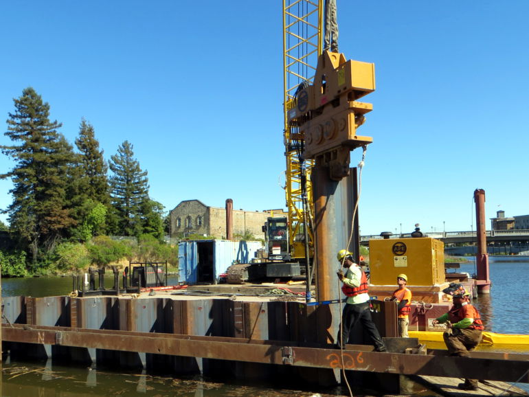 General contractor Nordic industries, based in Olivehurst, CA, was contracted for the excavation and earth work on the 1300 foot bypass, including installing terracing, colored pavement and a flexible concrete cellular block system to protect the side slopes of the bypass area. Due to their expertise in marine construction, Nordic called on West Coast Contractors (WCC) from Coos Bay, OR to install sheet pile walls at the river's edge. Permanent walls were placed to prevent erosion of the river bank, while temporary cofferdams were set in place to hold back the river so necessary work could take place near the shore. WCC completed this project in January, 2015.