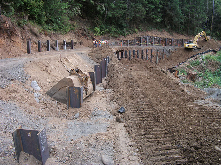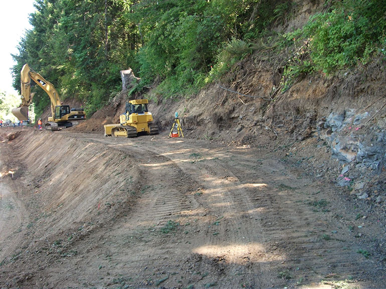 West Coast Contractors was contracted by the Lincoln County Public Works Department for road work on Old River Road in the city of Siletz, located in the Coast Range of Lincoln County, Oregon. A 500 foot section of Old River Road running along the Siletz River had slipped due to years of erosion and heavy rains, rendering it impassable. With over 50 years of project experience, WCC is deployed their extensive line of heavy equipment to repair the slide and permanently stabilize the hillside below the road.