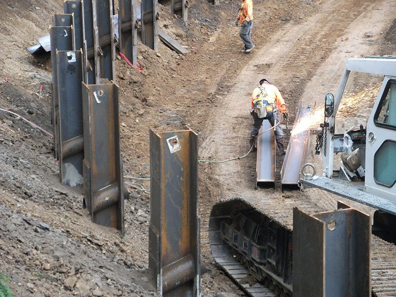 Because the portion of Old River Road runs tightly against the bank and is on a steep incline, this created an extra challenge for the crew and equipment as the narrow workspace will made it difficult for the heavy equipment to maneuver. The section of roadway required shoring and filling and a two-tiered, soldier-pile retaining wall consisting of over 100 H-Piles and pre-stressed concrete lagging panels were constructed to stabilize the slide. WCC partnered with Malcolm Drilling, one of the nation's distinguished foundation contractors, to drill into the rock to anchor the piling and tie-backs, giving the area of road the support needed to prevent slides in the future.