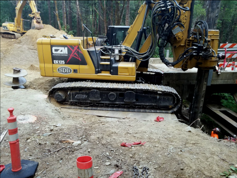 The repairs consist of driving piling on either side of the bridge and sliding steel beams under the bridge, resting on the piling. The abutment will then be removed and rebuilt using reinforced concrete. This will be tied into two 36" shafts drilled 38 feet into the rock and filled with reinforced concrete. The road meeting with the bridge will then be rebuilt, the temporary supports removed and traffic will resume.