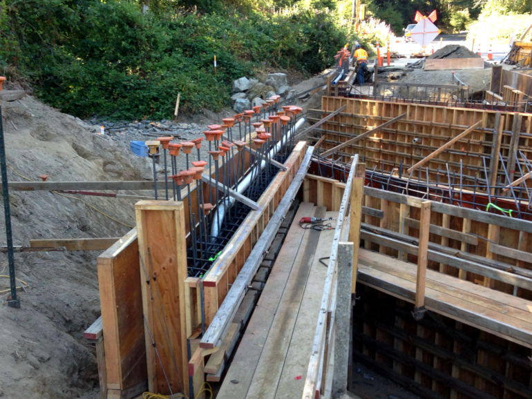 The project consisted of temporary shoring along Sultan Creek, excavation and removal of the old culverts, then constructing the cast-in-place bridge and bicycle rail. Although the section of highway was under traffic throughout the project, work was performed at a fast pace. The narrow road and overhead power lines added to the complexity of the job.